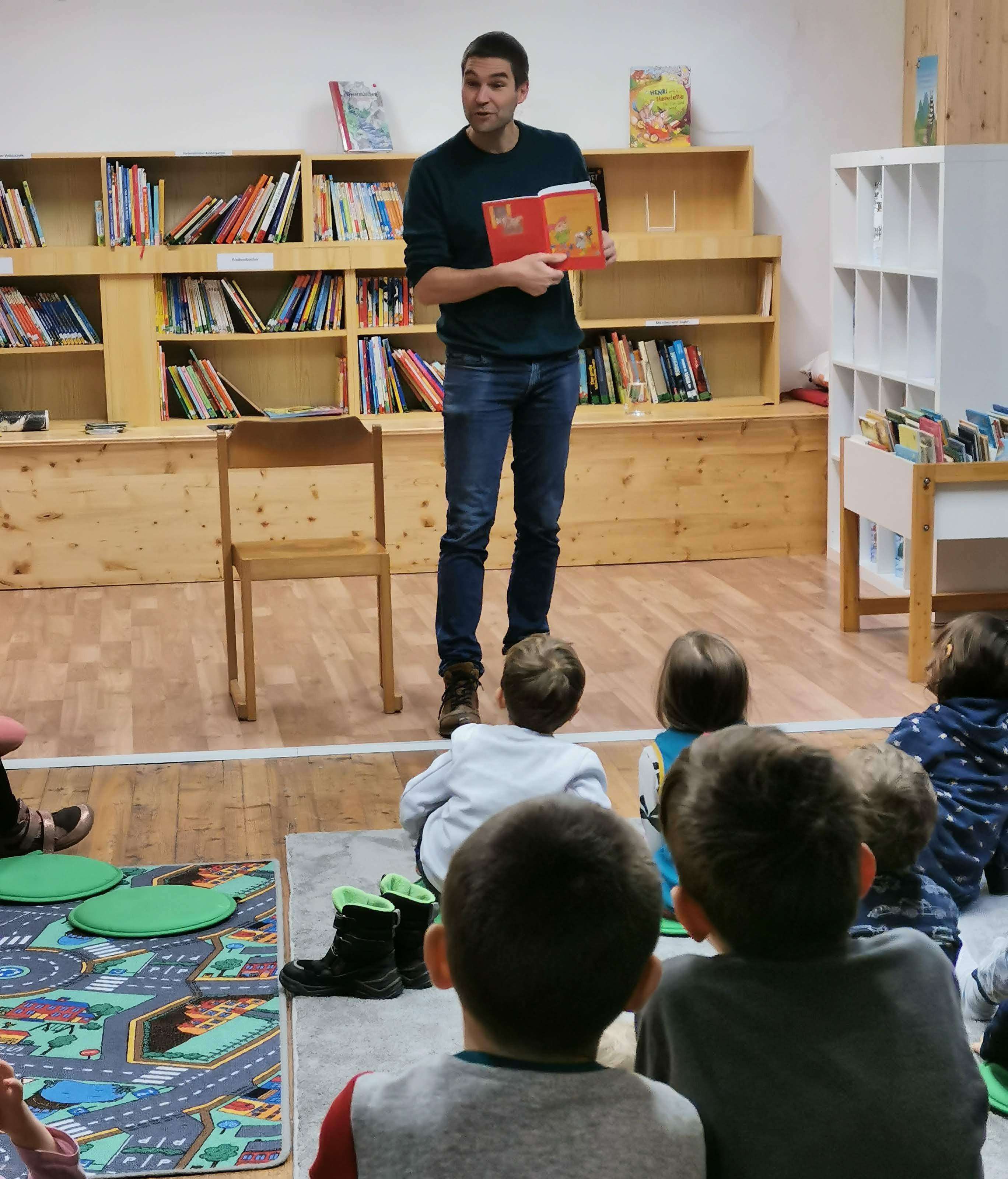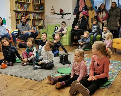 Hannes Hörndler, der dabei selbst zum Kind wurde, begeisterte die kleinen Zuhörer und band sie mit in seine Geschichten ein.