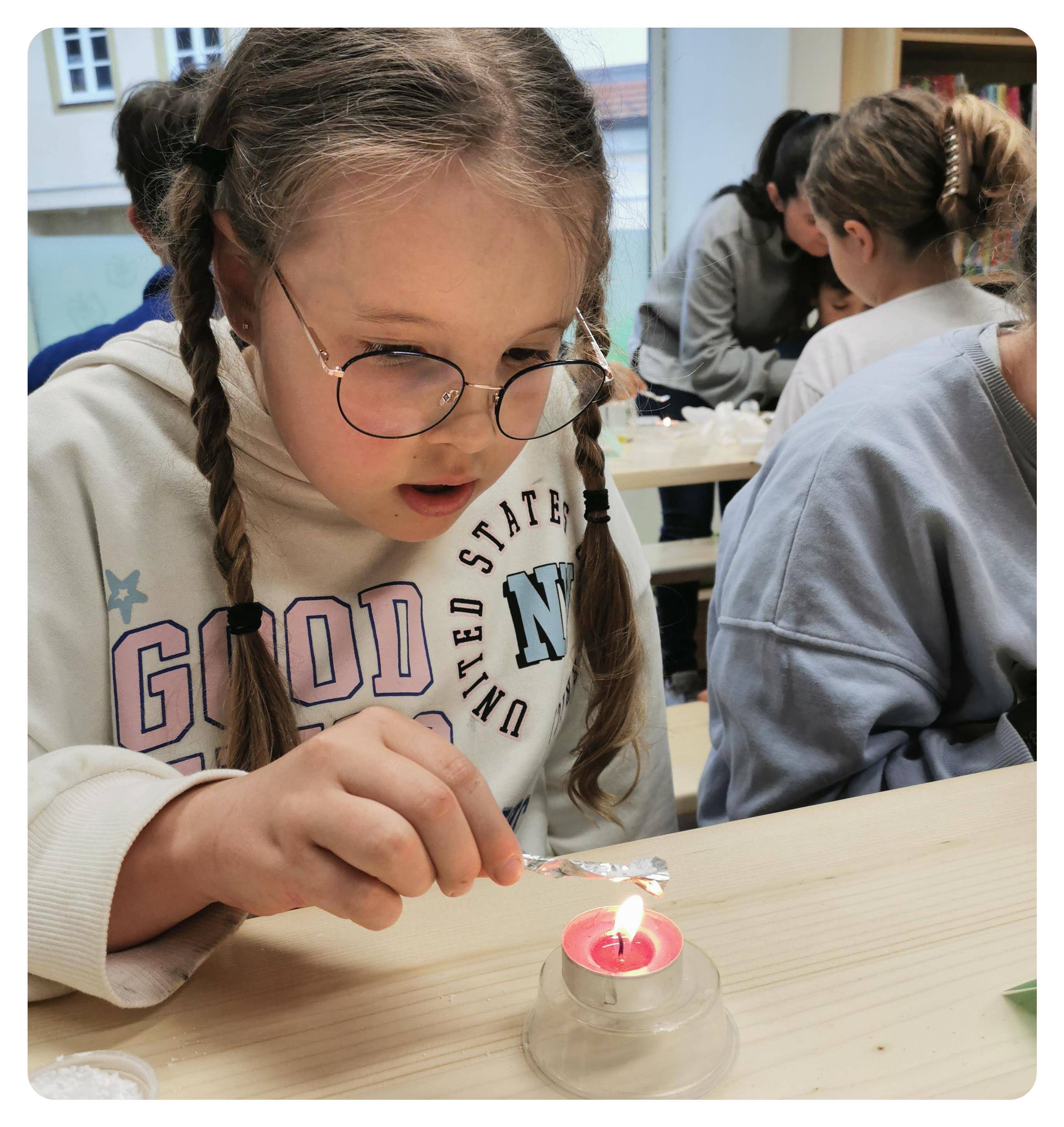 Anschließend durften die Kinder auf einem aus Folie gefalteten Löffel Staubzucker über einer Kerze schmelzen. Sie beobachteten, wie der Zucker erst flüssig wurde und dann karamellisierte. Das fertige Karamell durften die Kinder kosten, was für große Begeisterung sorgte und das Experiment zu einem besonderen Erlebnis machte.