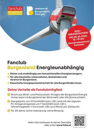FANCLUB Burgenland EnergieunabhängigKemeten28. Okt. 2025Nutze die Gelegenheit und informiere dich über die größte Energiegemeinschaft des Burgenlandes!Bei Fragen einfach anrufen.Gemeinde Kemeten