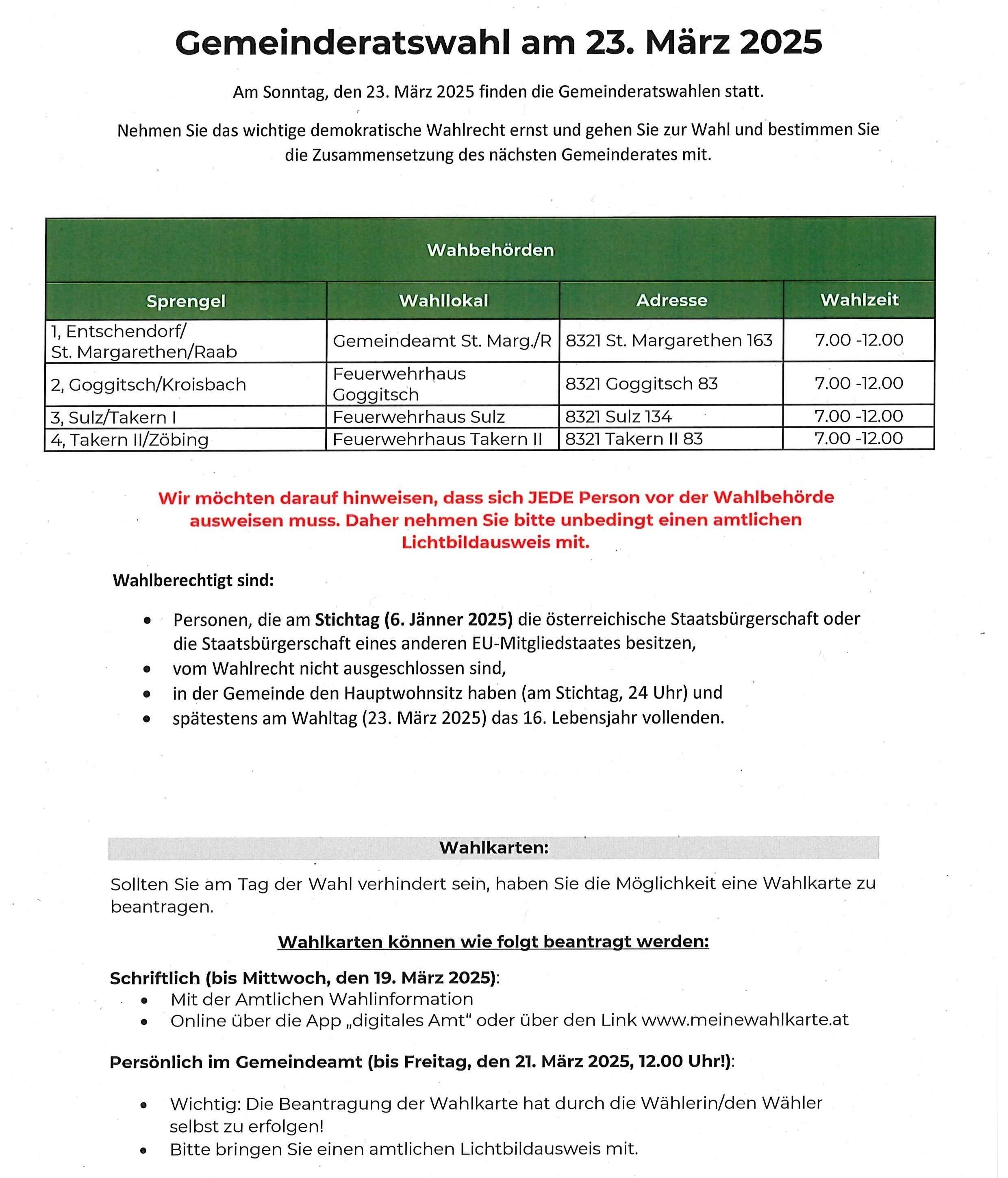 Gemeinderatswahl 23.03.2025St. Margarethen an der Raab20. Feb. 2025Online über die App „digitales Amt“ oder über den Link www.meinewahlkarte.at