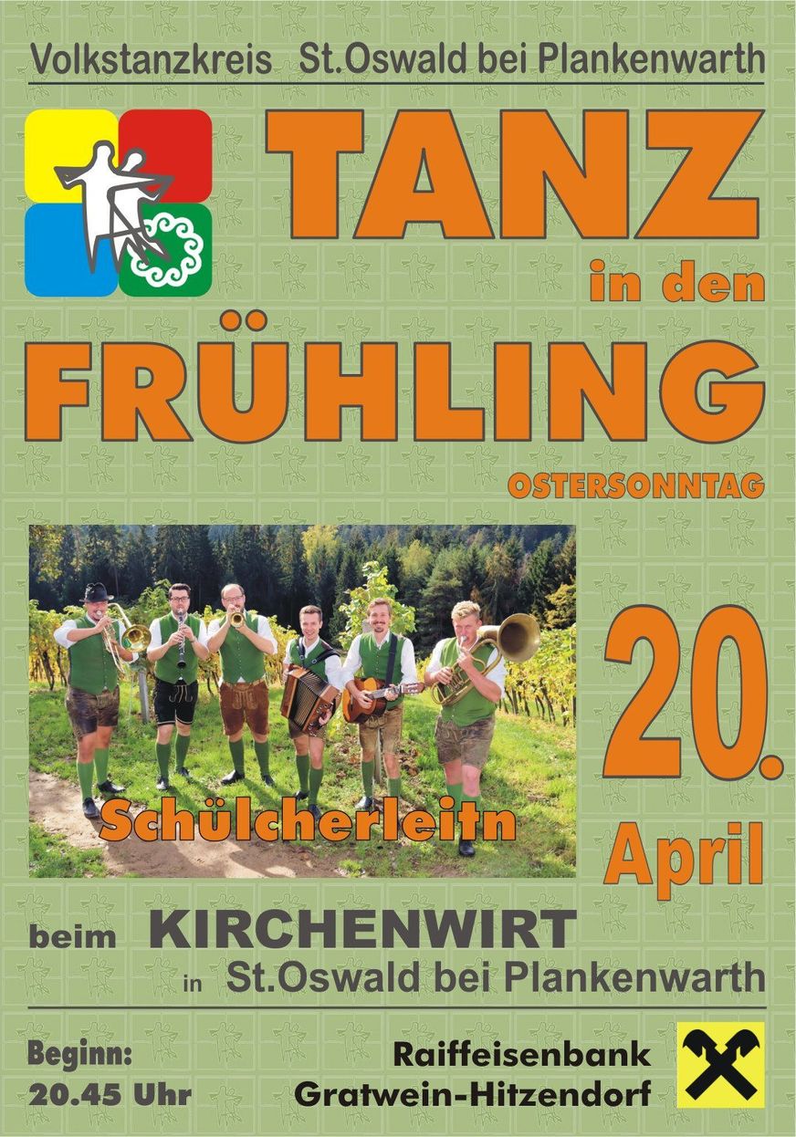 Heute Abend - TANZ in den FRÜHLINGVolkstanzkreis Sankt Oswald bei Plankenwarth20. Apr. 2025Ostersonntag 20.4.2025 beim Kirchenwirt20:45 Auftanz der Kindergruppe anschl. Auftanz vom Volktanzkreis23:30 Verlosung der Hauptpreise24:00 TanzeinlageWir freuen uns schon auf eine lustige Ballnacht!