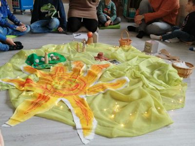 Im gemütlichen Kreis lauschten die Kinder gespannt, während Magdalena lebendig und anschaulich das Märchen erzählte. Interaktiv wurden sie in die Handlung eingebunden, indem sie gemeinsam einen Brunnen legten, eine Blumenwiese schmückten und mit Wattebällchen Schnee zauberten. ❄️