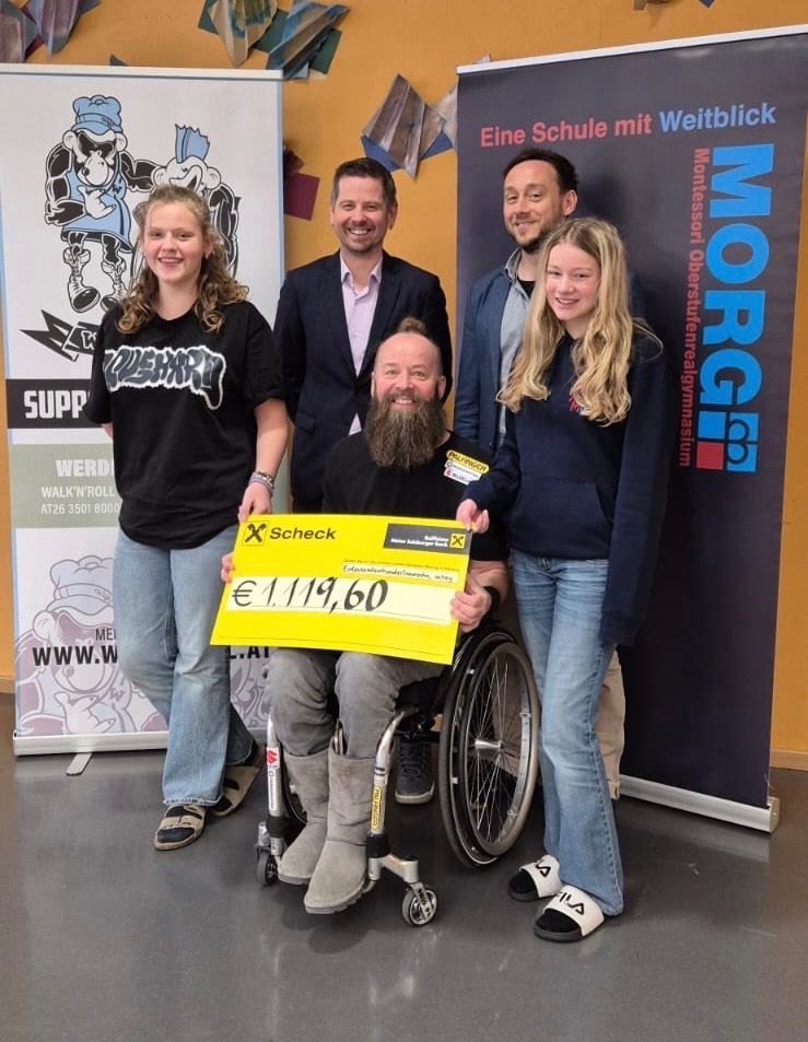 MORG und MMS Grödig spenden gemeinsam für den Verein WALK’N’ROLL. Der Verein will körperlich behinderten Menschen mit Visionen helfen diese nachhaltig umzusetzen. Thomas Geierspichler hat uns letztes Jahr besucht und einen Vortrag über sein Leben gehalten und die Schüler*innen motiviert ihr Leben in die Hand zu nehmen. Parallel wurden EUR 1119,60 an Spenden gesammelt und Ende Februar an den Obmann überreicht.