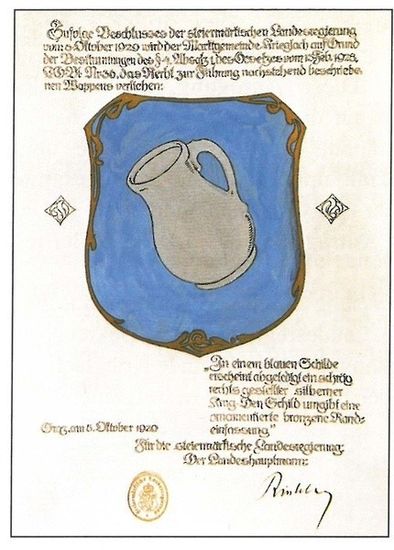 Am 11. Juli 1929 durfte sich Krieglach zum ersten Mal als Marktgemeinde ausgeben. Das Marktwappen zeigt einen weißen Krug auf dunkelblauem Grund.