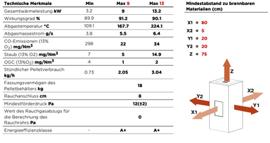 Pelletofen für den RLU-Betrieb geeignet, mit externer Verbrennungsluftzufuhr.