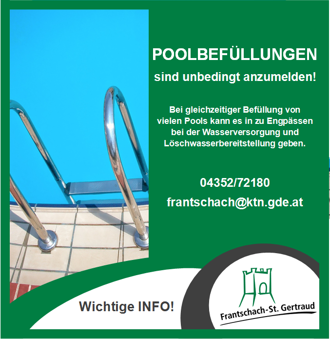 Meldungen zur Poolbefüllung nimmt die Gemeindeverwaltung telefonisch unter 04352/72180 oder per E-Mail an frantschach@ktn.gde.at entgegen. Geben Sie uns neben der erforderlichen Wassermenge auch einen Alternativtermin bekannt, damit wir die Befüllungen entsprechend koordinieren können. Durch Ihre Anmeldung tragen Sie wesentlich zur Sicherung der Trinkwasserversorgung bei!