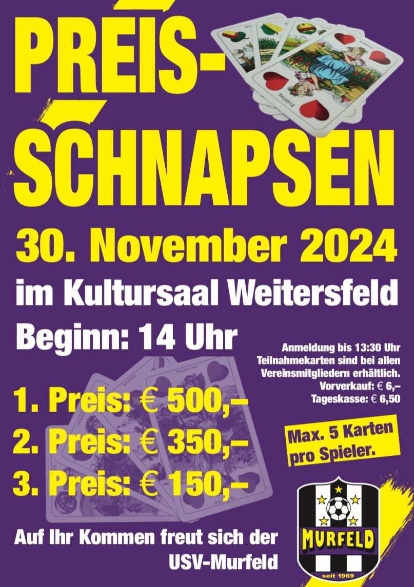 Am 30.11.2024, Beginn um 14:00 Uhr, lädt der USV Murfeld Süd herzlich zu seinem traditionellen Preisschnapsen im Kultursaal Weitersfeld ein.