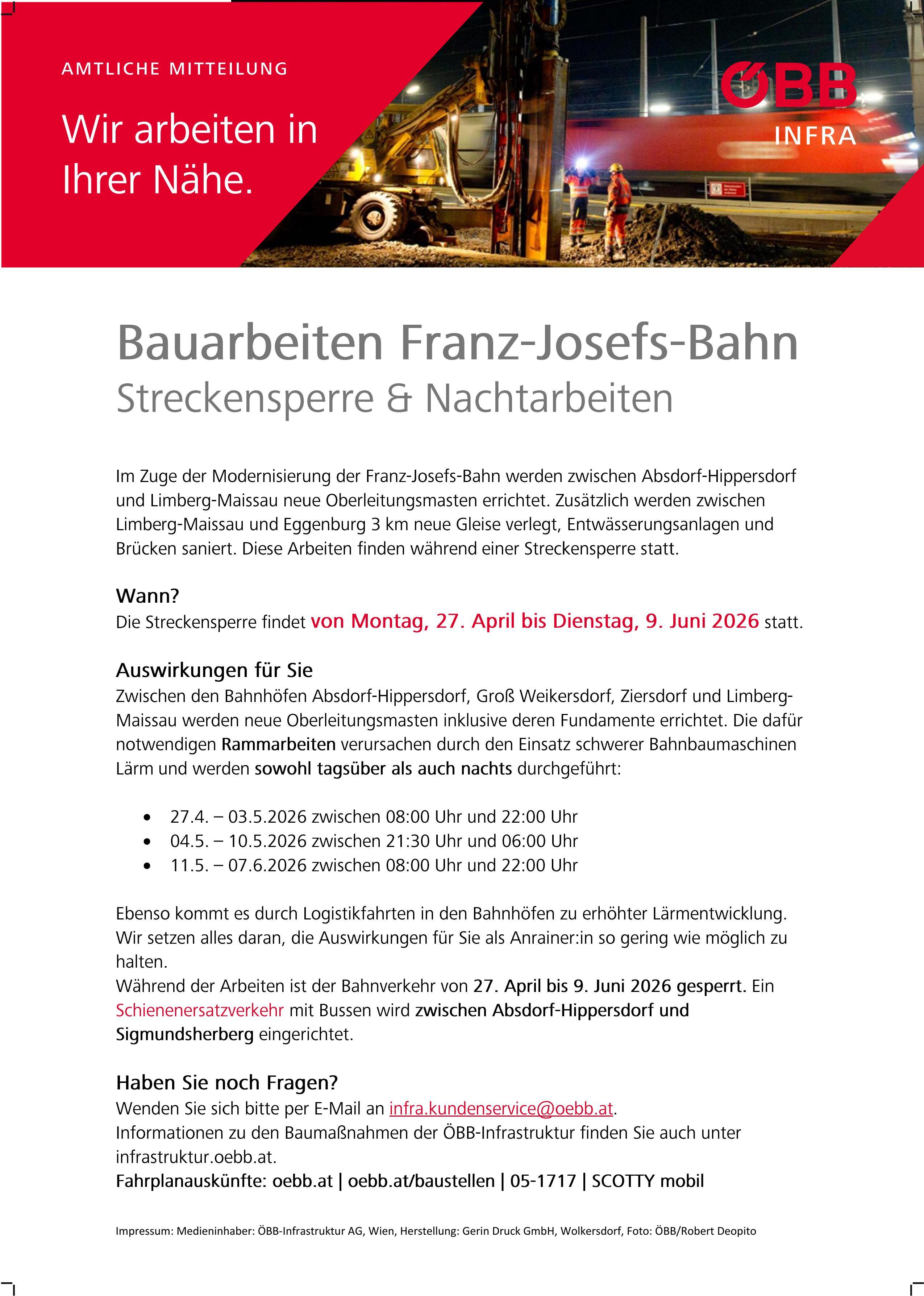 Diese Arbeiten finden während einer Streckensperre von 27. April bis 09. Juni 2026 statt. Ein Schienenersatzverkehr zwischen Sigmundsherberg und Absdorf-Hippersdorf wird eingerichtet.