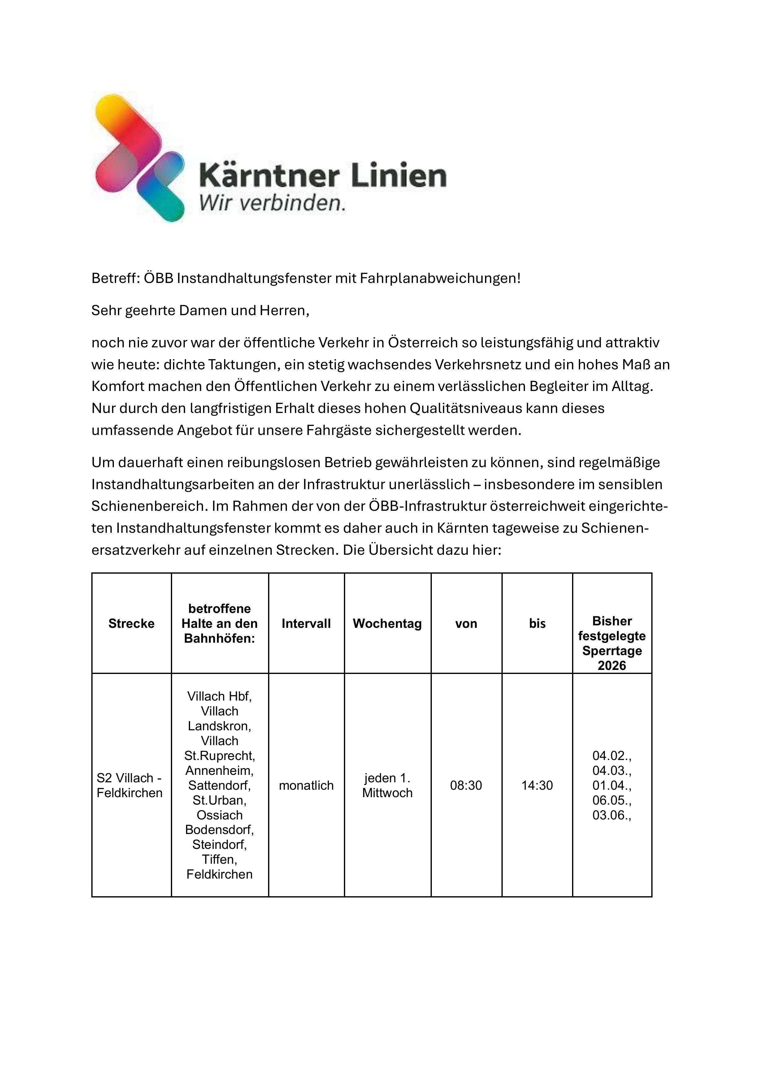 Kärtner Verkehrsbund - geplante Instandhaltungsarbeiten der ÖBB