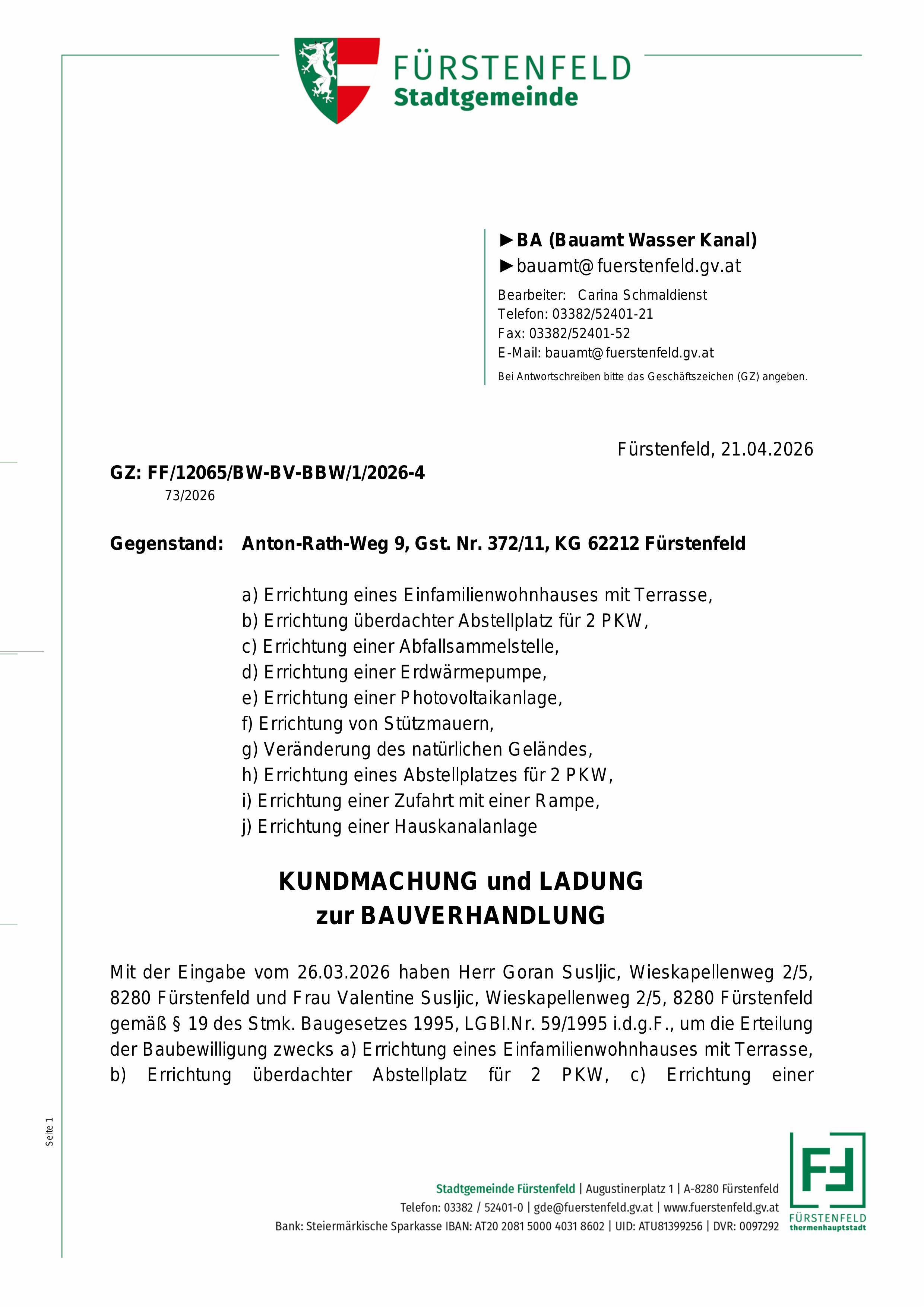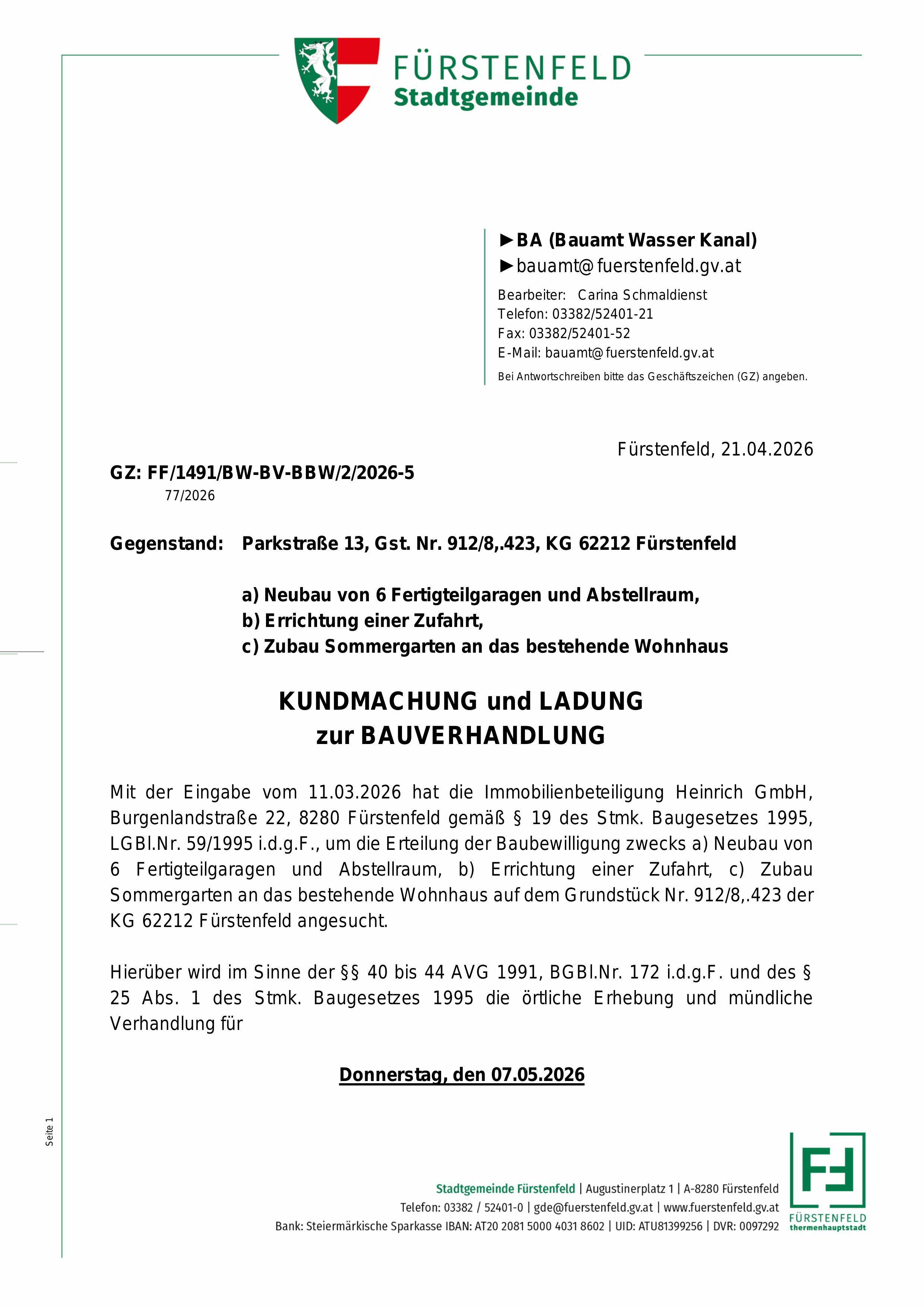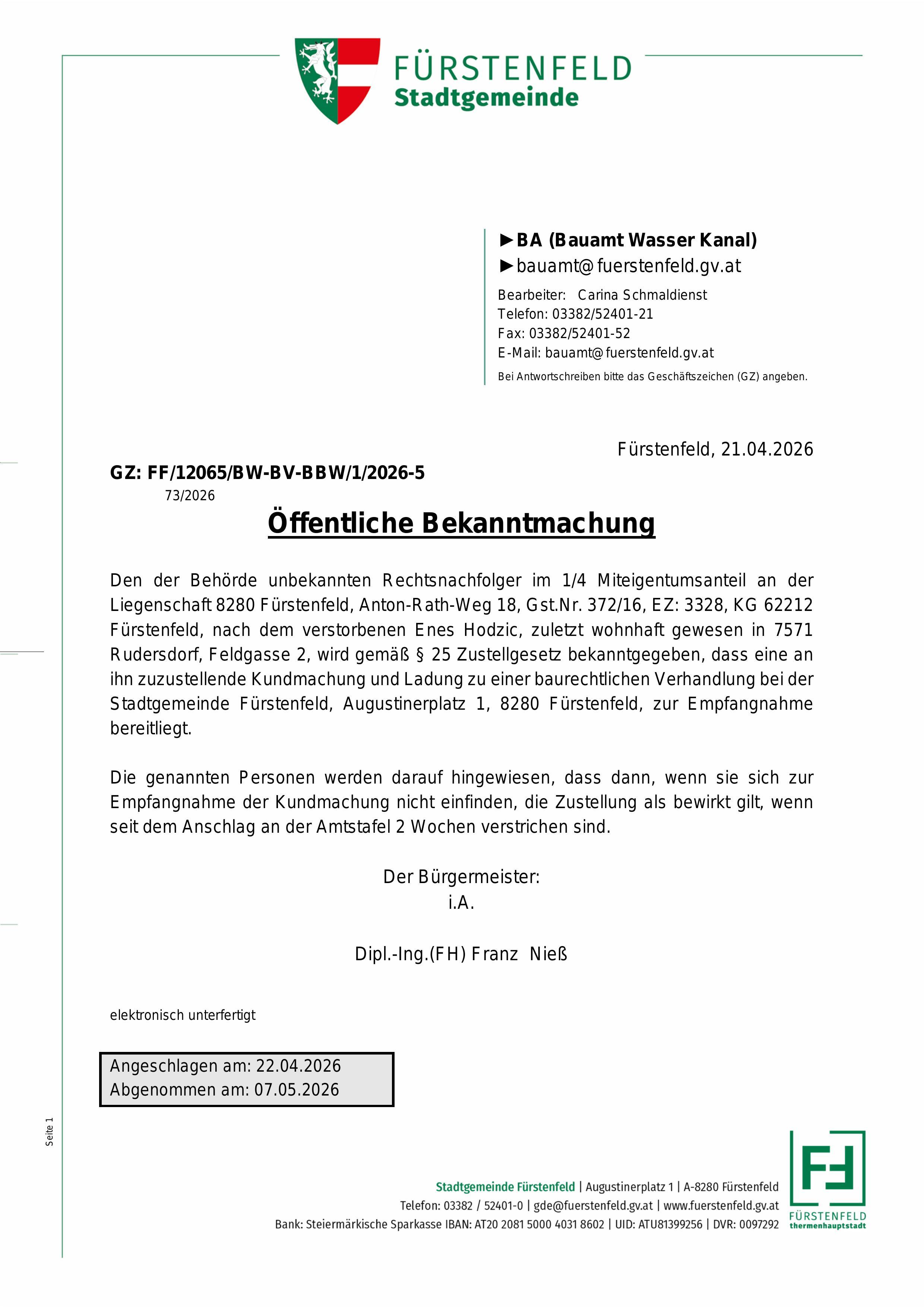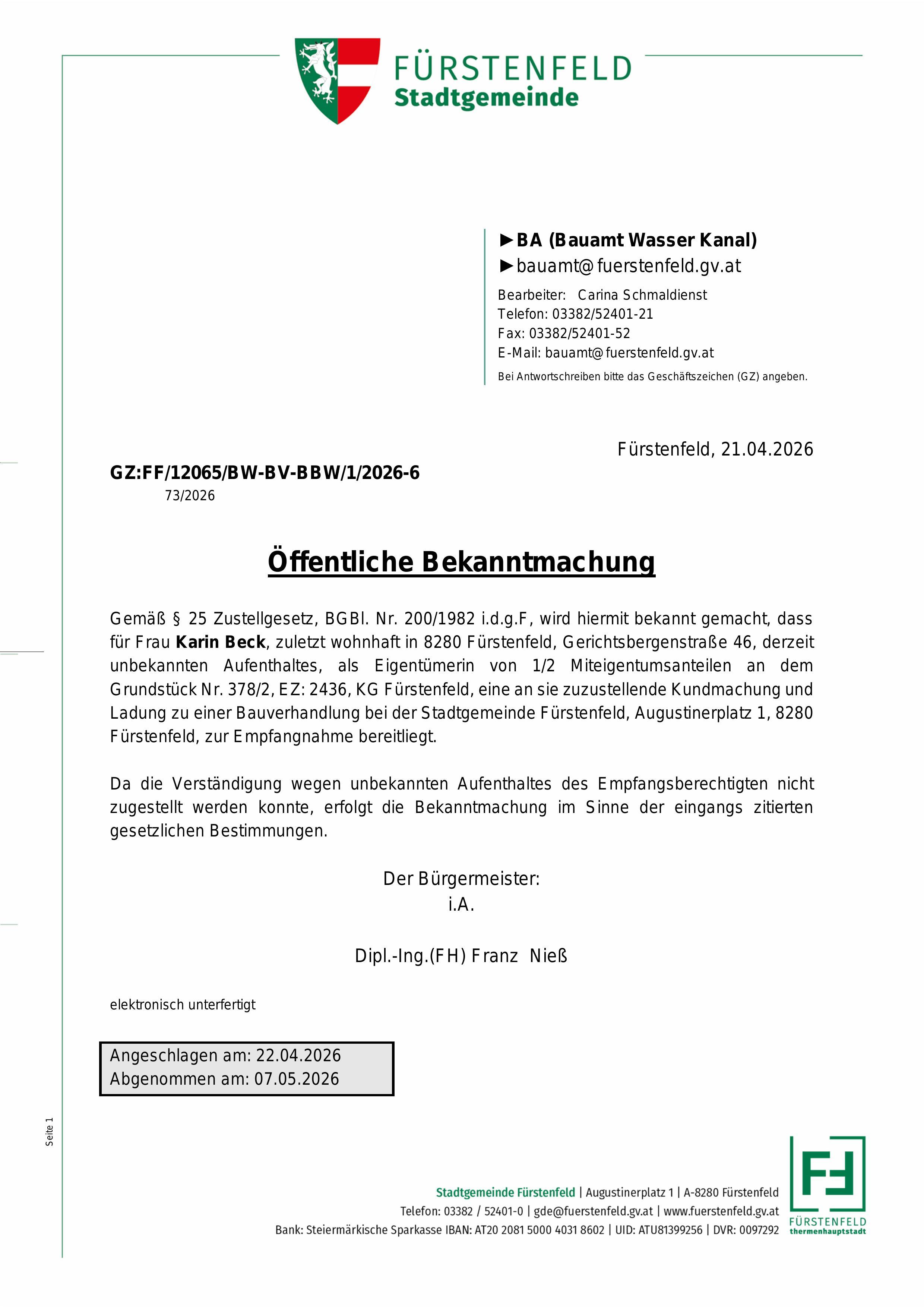 Öffentliche Bekanntmachung: § 25 Zustellgesetz Eigentümerin von 1/2 Miteigentumsanteilen an dem Grundstück Nr. 378/2, EZ: 2436, KG Fürstenfeld