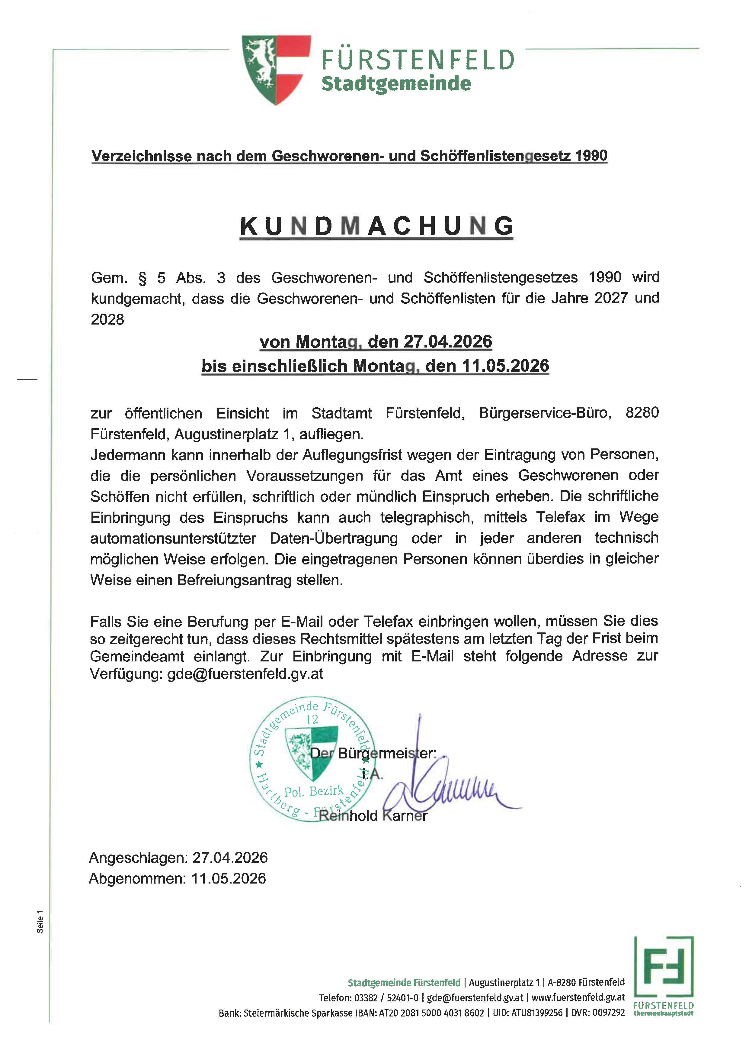 Kundmachung: Gem. § 5 Abs. 3 des Geschworenen- und Schöffenlistengesetzes 1990 wird kundgemacht, dass die Geschworenen- und Schöffenlisten für die Jahre 2027 und 2028