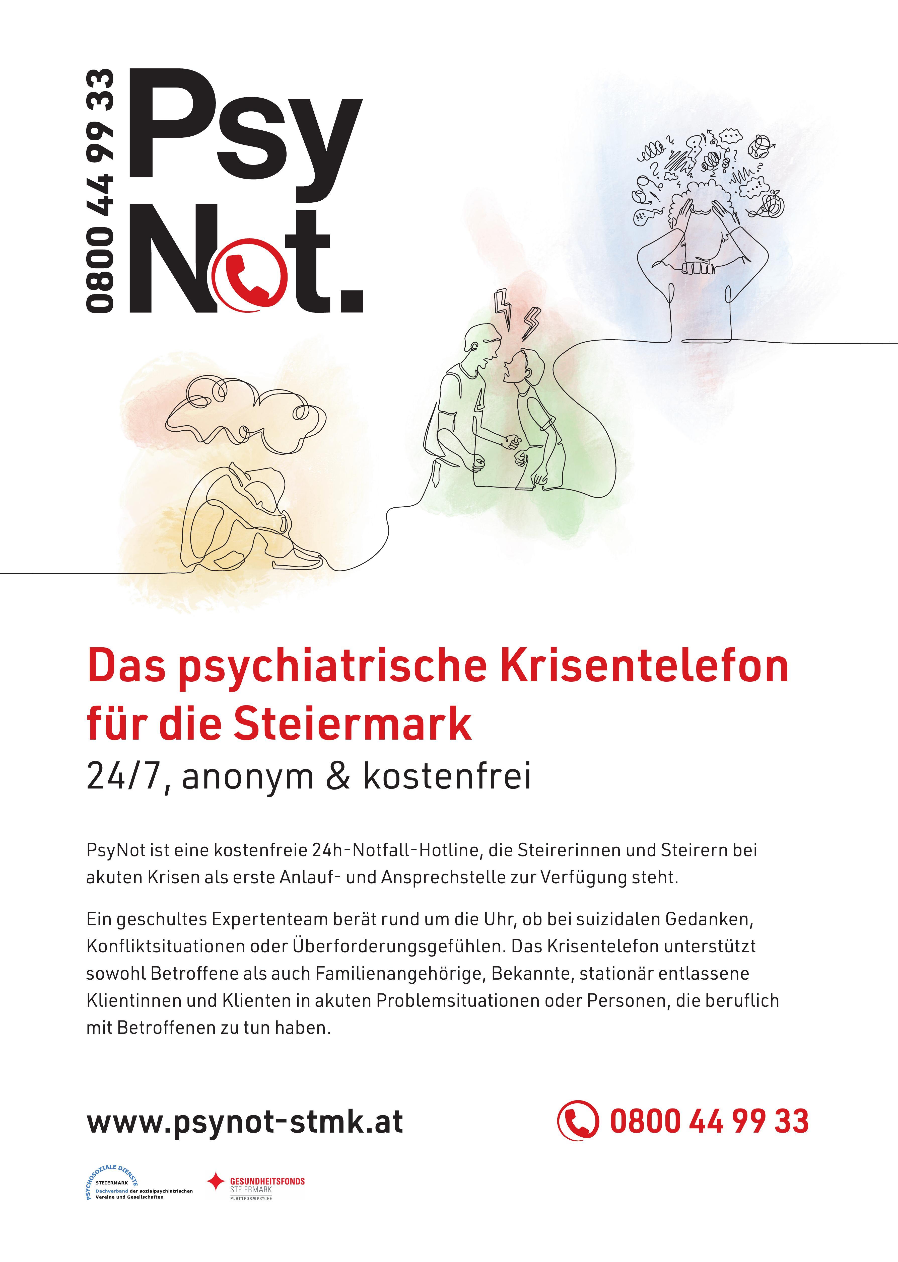PsyNot ist die offizielle 24-Stunden-Notfall-Hotline für psychische Krisen in der Steiermark, finanziert vom Gesundheitsfonds Steiermark. Sie steht als erste Anlaufstelle bei akuten psychischen Notfällen zur Verfügung.