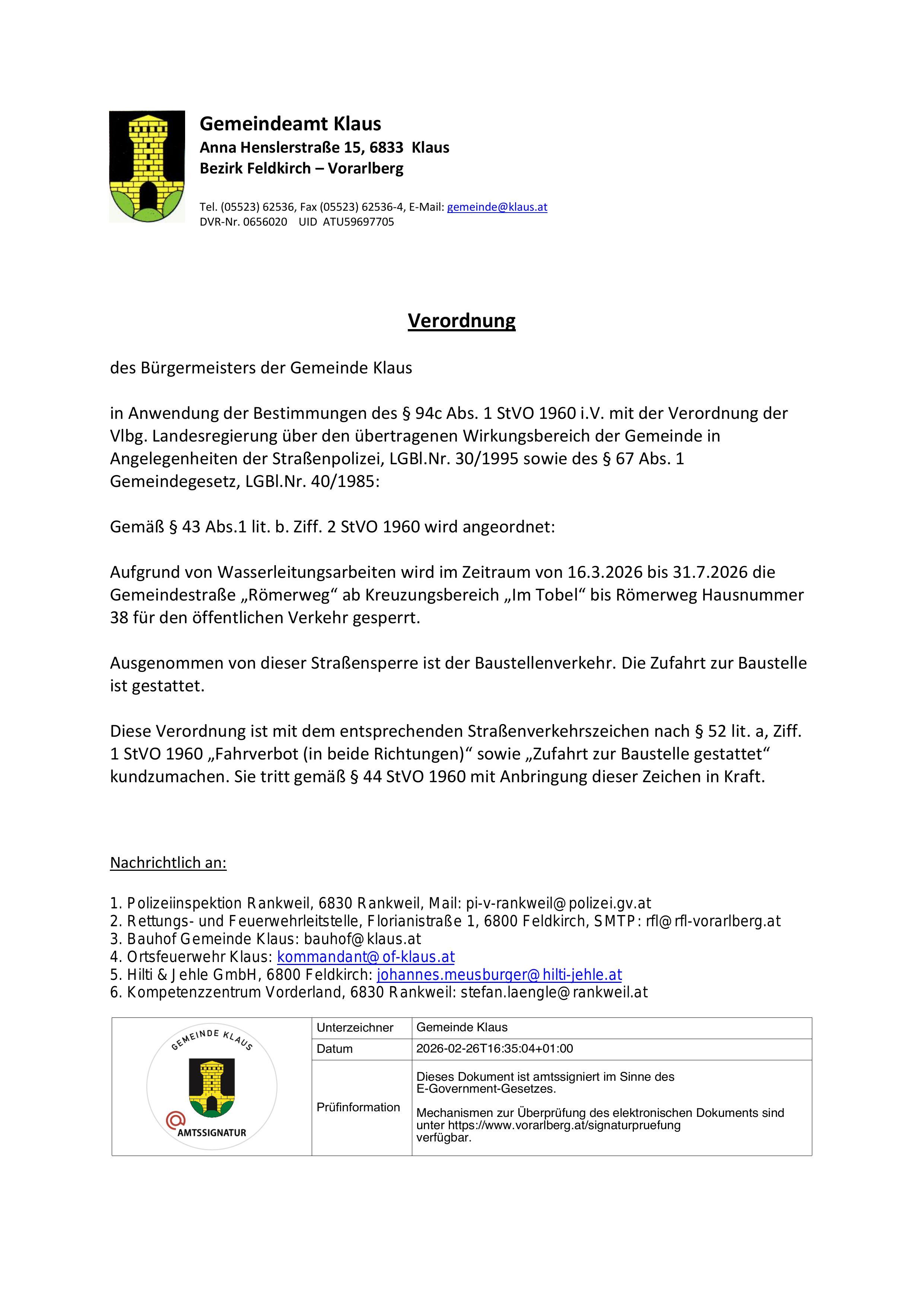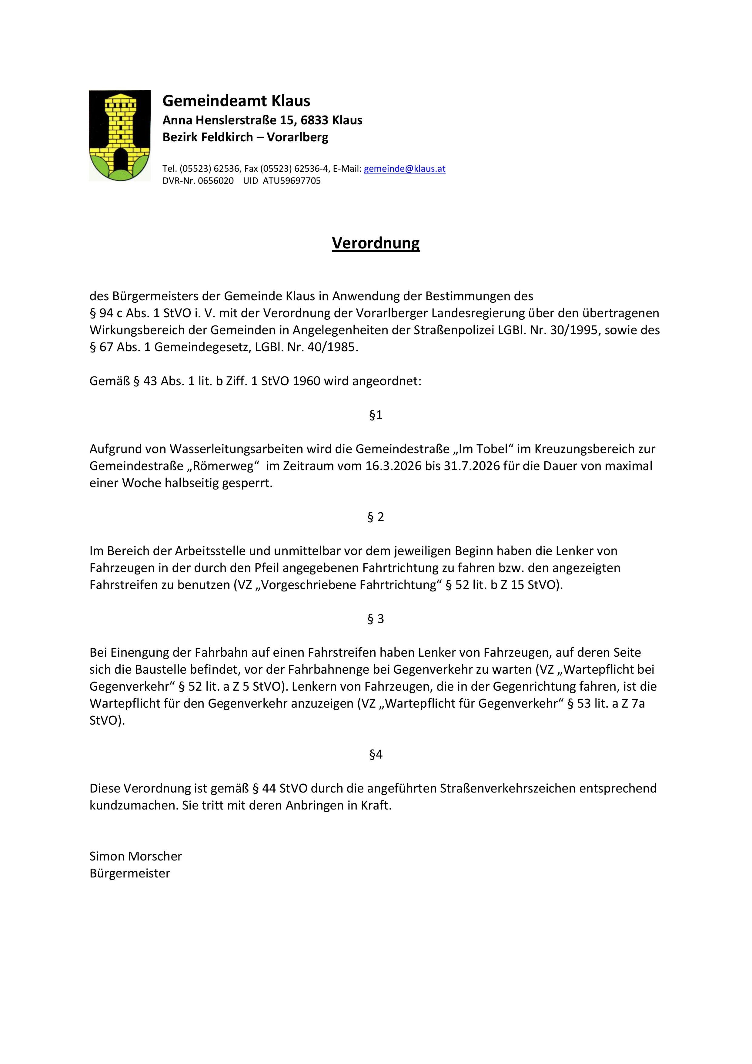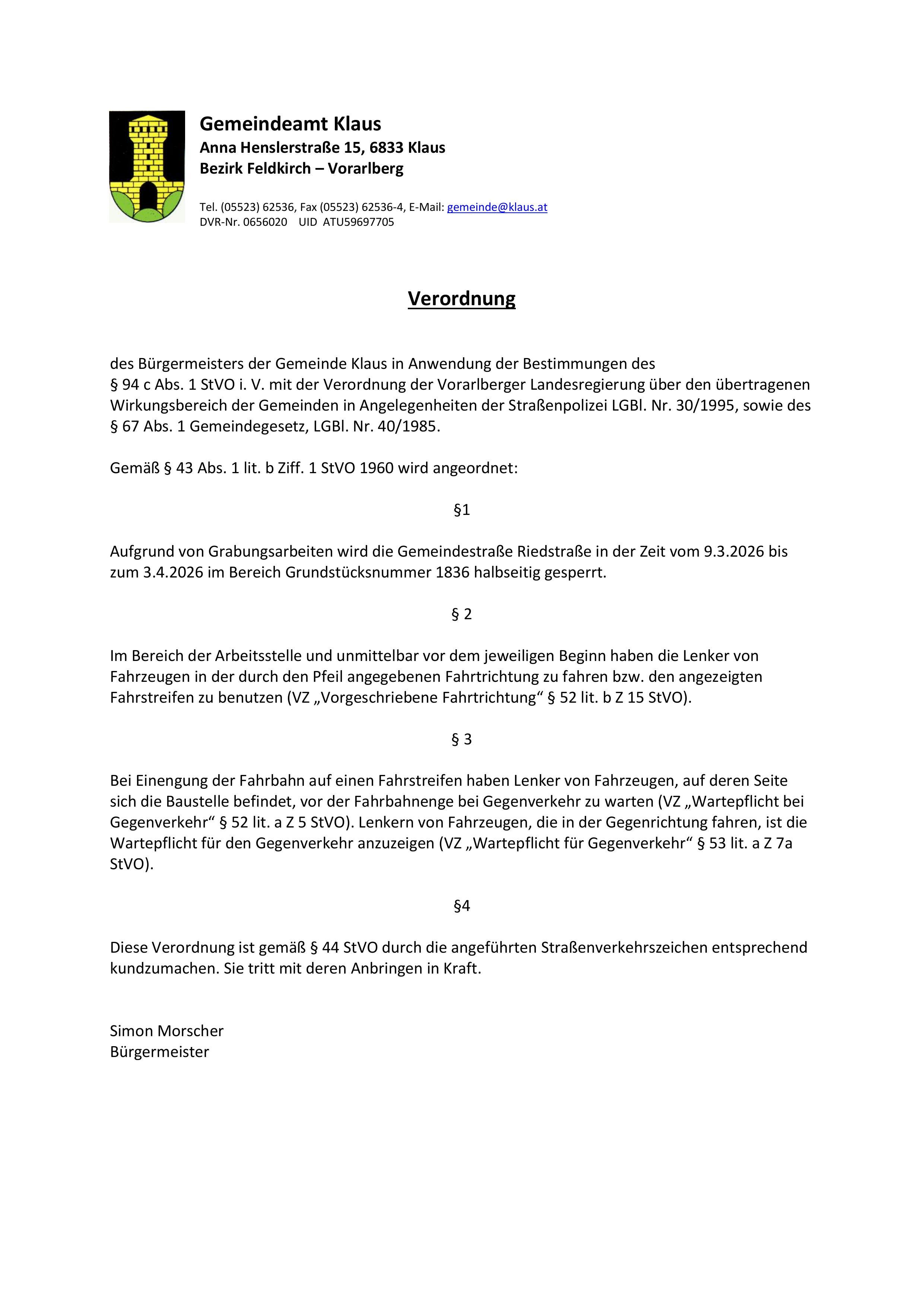 Aufgrund von Grabungsarbeiten wird die Gemeindestraße Riedstraße in der Zeit vom 9.3.2026 bis zum 3.4.2026 im Bereich Grundstücksnummer 1836 halbseitig gesperrt.