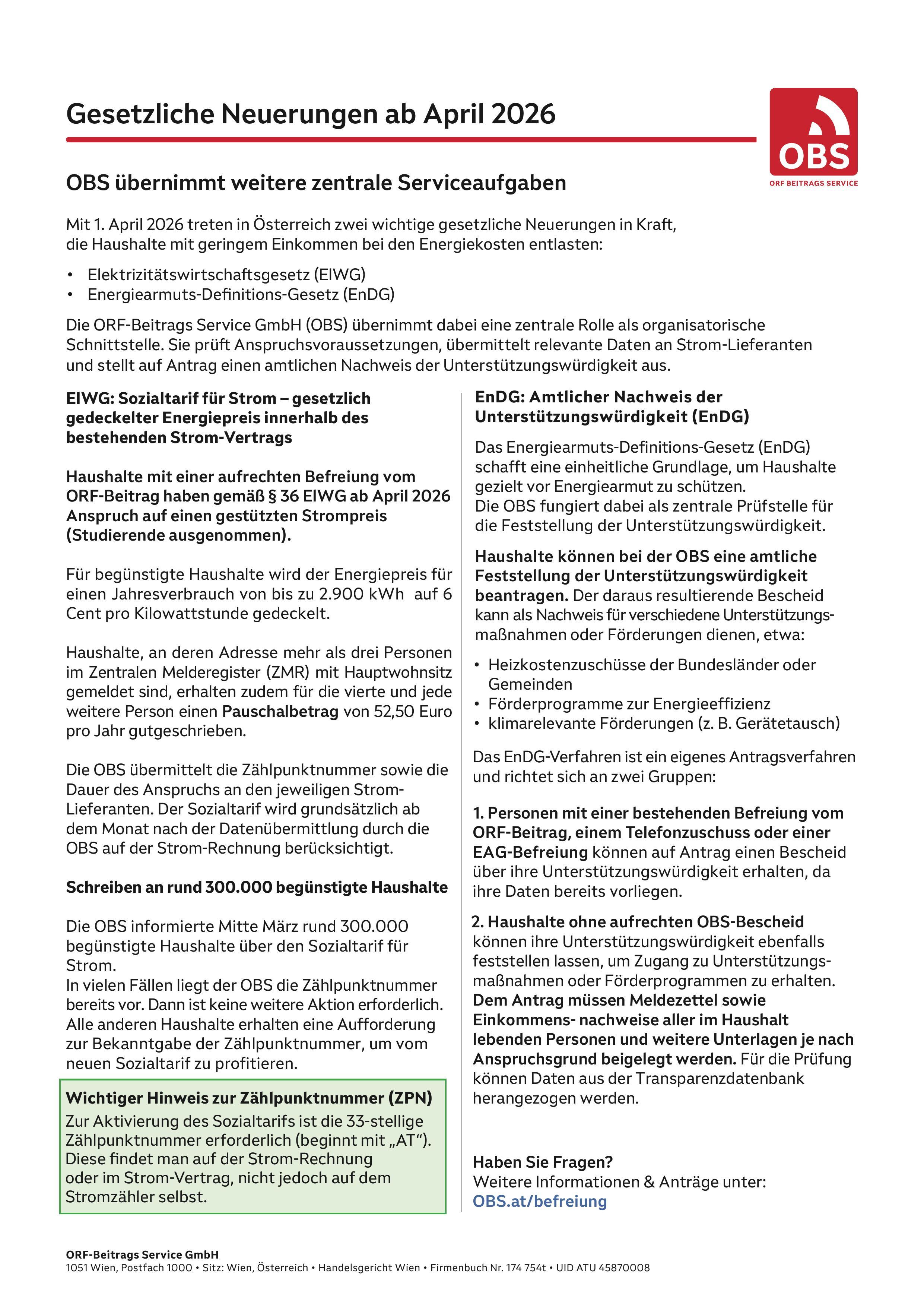 • Der Gesetzgeber führt für einkommensschwache Haushalte ab 1. April 2026 einen Sozialtarif in Form eines gestützten Strom-Preises ein (Elektrizitätswirtschaftsgesetz – ElWG mit Kundmachung vom 23.12.2025). Die ORF-Beitrags Service GmbH (OBS) fungiert hier als zentrale Schnittstelle zwischen Bürgerinnen und Bürgern und den Strom-Lieferanten.