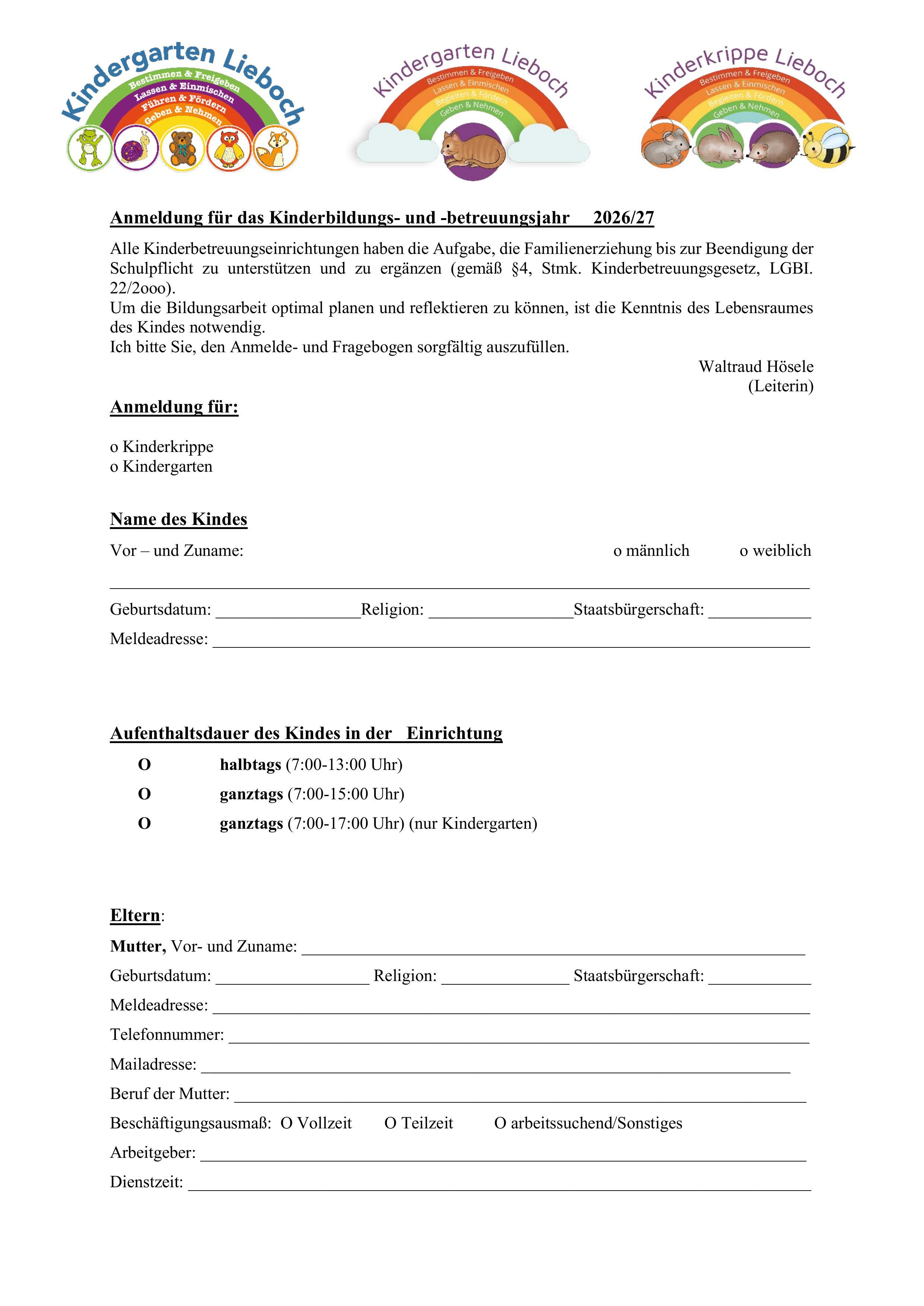 Anmeldung für das Kinderbildungs- und -betreuungsjahr 2026/2027