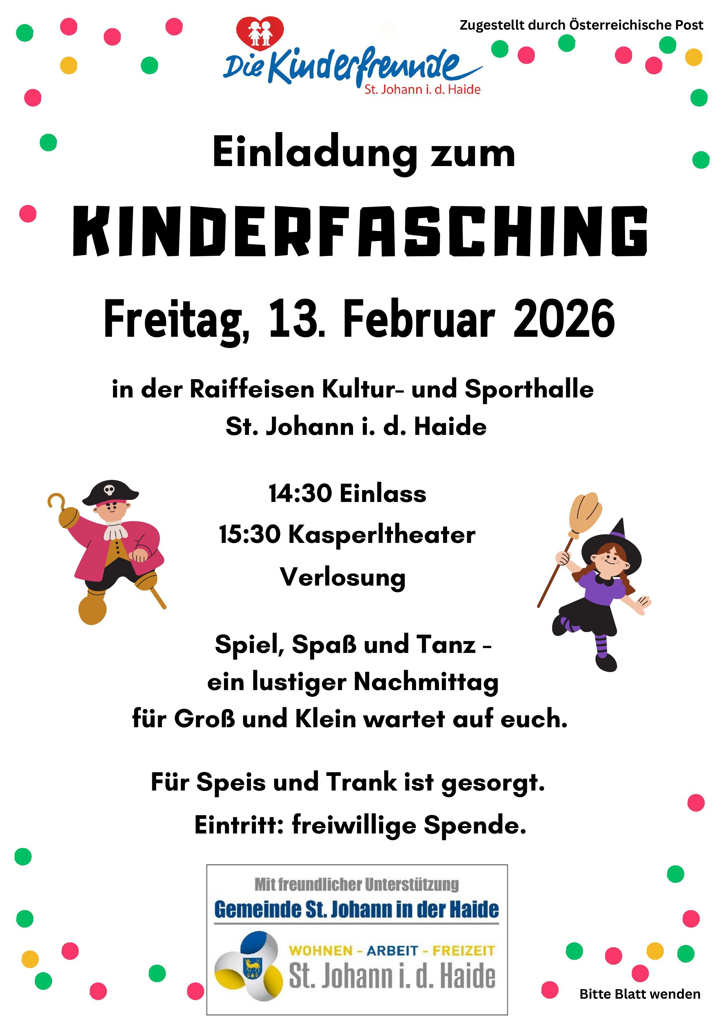 Die Kinderfreunde St. Johann laden am 13. Februar 2026 herzlich zum Kinderfasching ein. 🥳