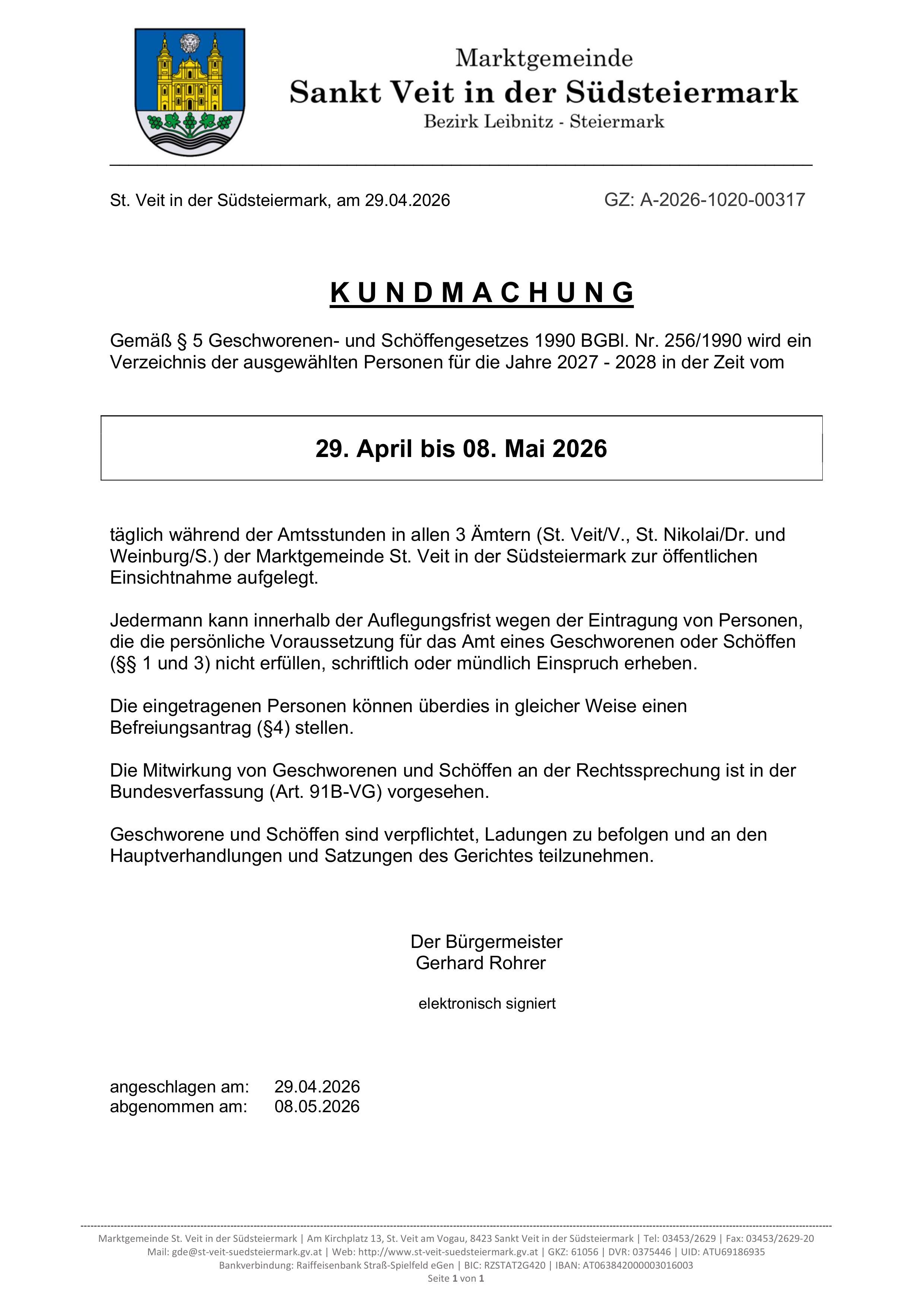 Gemäß Geschworenen- und Schöffengesetz wird ein Verzeichnis der ausgewählten Personen für die Jahre 2027 - 2028 in der Zeit vom 29. April bis 08. Mai 2026 täglich während der Amtsstunden in allen 3 Ämtern (St. Veit am Vogau, St. Nikolai ob Draßling und Weinburg am Saßbach) der Marktgemeinde St. Veit in der Südsteiermark zur öffentlichen Einsichtnahme aufgelegt.