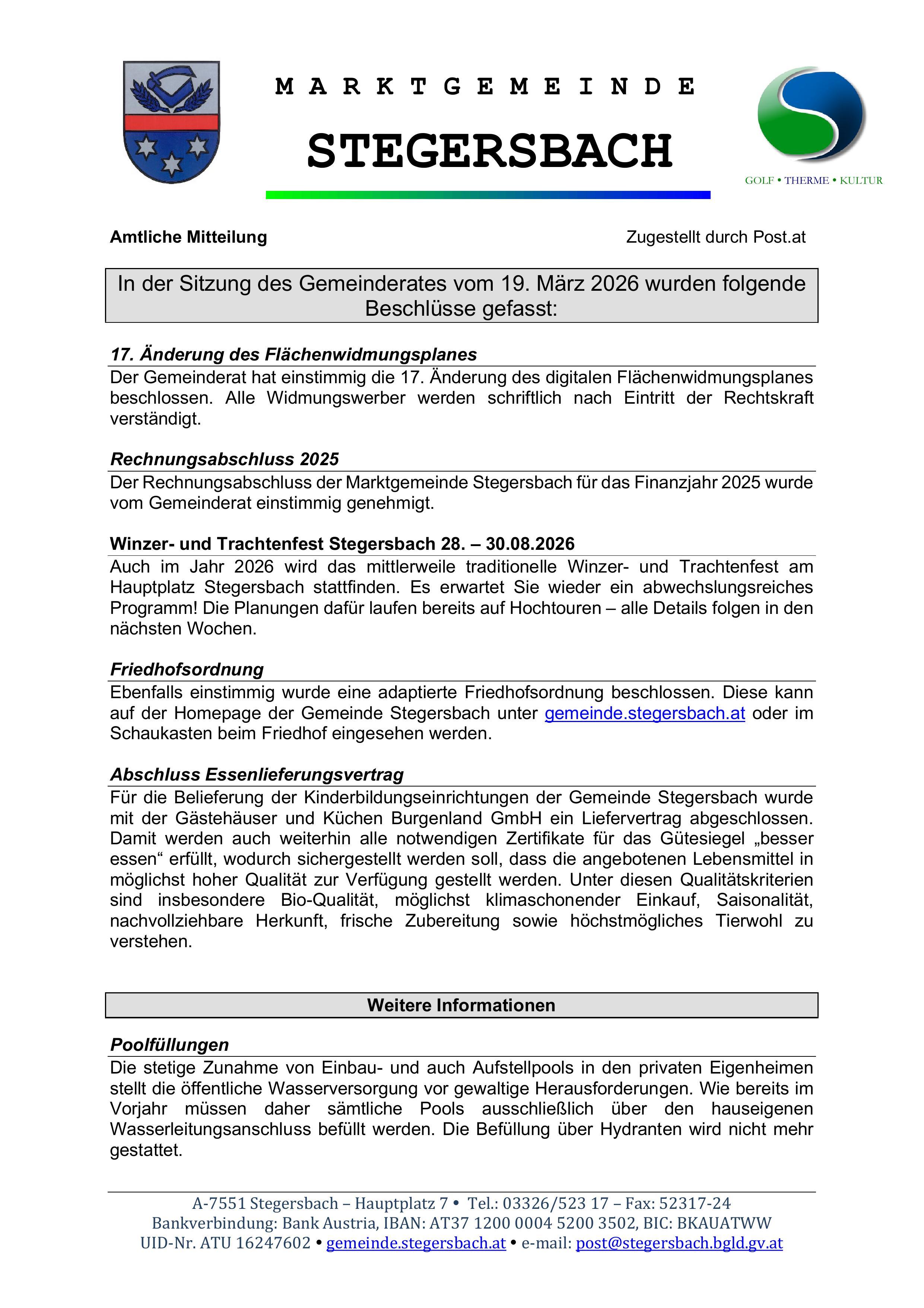 Amtliche Mitteilung der Marktgemeinde Stegersbach!