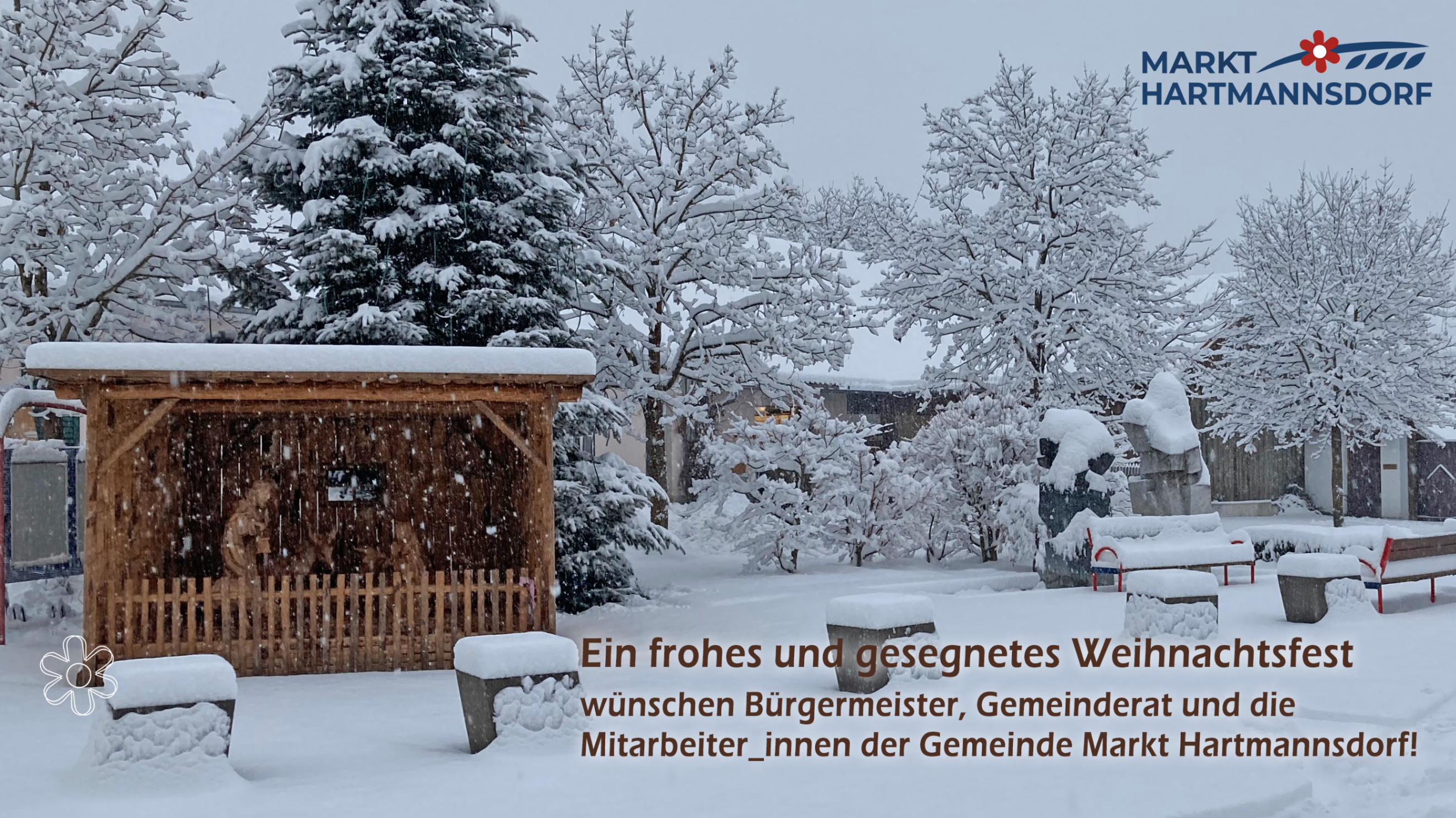 Weihnachtswunsch mit Krippe und Schnee