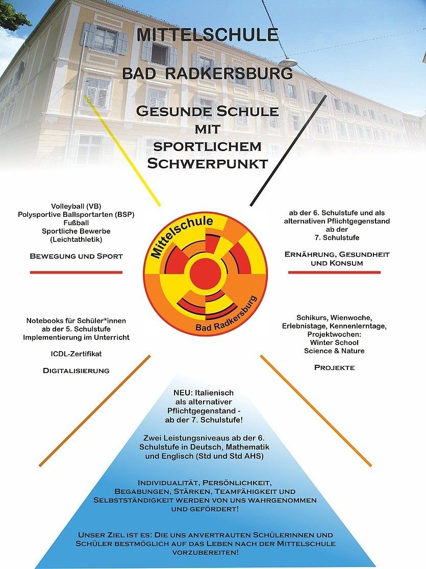 Leitbild der Mittelschule Bad Radkersburg Die MS Bad Radkersburg ist eine Schule mit sportlichem und kreativem Schwerpunkt. Polysportive Möglichkeiten Fußball, Volleyball, Ausdauertraining und Jazzgymdance sowie eine über 4 Jahre aufbauende Grundausbildung im Bereich der Informatik und Erlangung des ECDL mit Abschluss der 4. Klasse. Werken im technischen und im textilen Bereich, Bildnerische Erziehung, kreatives Gestalten sowie Ernährung und Gesundheit bilden im Fächerkanon der Wahlpflichtfächer den Schwerpunkt. Unterrichts- und Erziehungsarbeit Neben der Vermittlung der Sach-, Selbst- und Sozialkompetenz liegt uns ganz besonders am Herzen, die Schülerinnen und Schüler umfassend und bestmöglich für einen Einstieg ins Berufsleben oder den Besuch einer mittleren oder höheren Schule vor zu bereiten. Mit der Führung von Integrationsklassen wollen die LehrerInnen der Schule schwächere SchülerInnen sozial integrieren und gezielt fördern. Die MS Bad Radkersburg will in Zusammenarbeit mit den Schulpartnern als Infoplattform für SchülerInnen und Eltern gesehen werden.